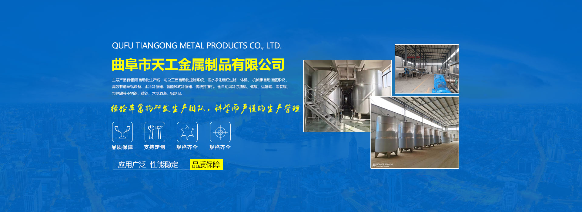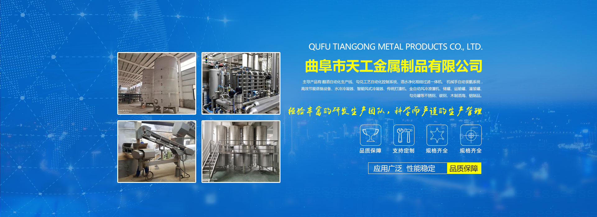 本公司是專業(yè)生產不銹鋼酒罐、不銹鋼釀造設備、不銹鋼發(fā)酵罐、釀酒、食品、生物、化工、環(huán)保設備、制藥設備的廠家。主導產品有:釀酒自動化生產線、勾兌工藝自動化控制系統(tǒng)、酒水凈化粗細過濾一體機、?機械手自動裝甑系統(tǒng),高效節(jié)能蒸鍋設備、水冷冷凝器、智能風式冷凝器、傳統(tǒng)打渣機、全自動風冷涼渣機、儲罐、運輸罐、灌裝罐、勾兌罐等不銹鋼、碳鋼、木制酒海、鋁制品。各種反應釜、發(fā)酵罐、提取罐、氣體混合罐、烘干設備等大中型設備安裝,平臺制作、工藝管線制作安裝,容器設備內外防腐保溫。產品規(guī)格齊全,質量可靠。